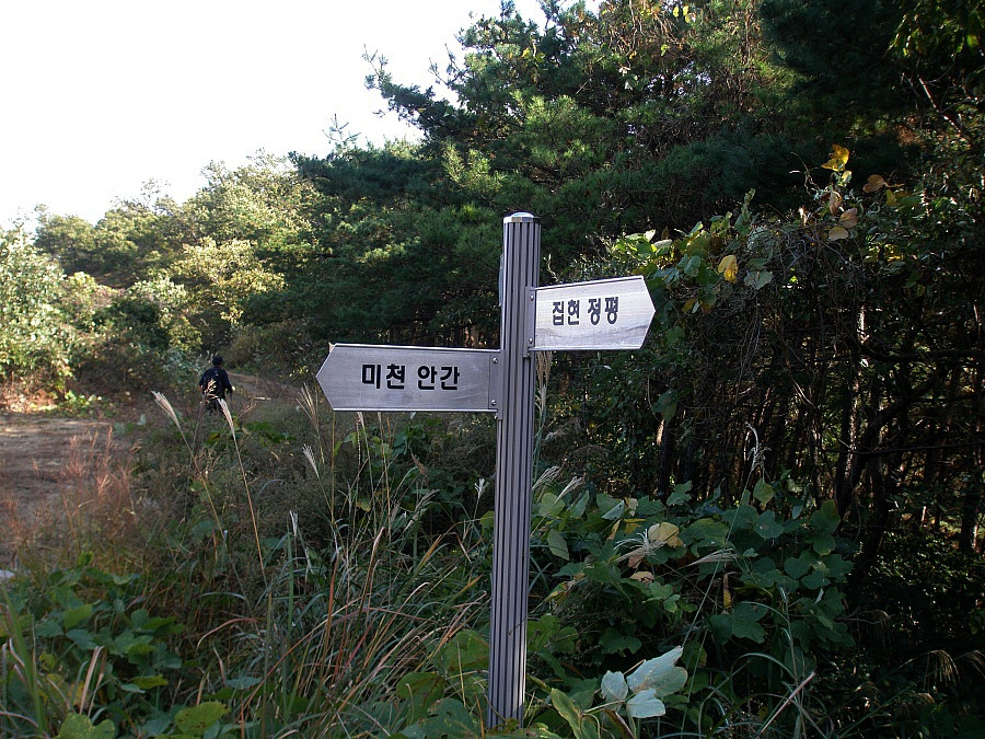 월명암을 뒤로하고 안부 삼거리에서 진행하니 미천,안간이란 길을 안내하는 표지판이 섰다. 언뜻 보기에 "미친인간"처럼 보여 웃으며 지나치고 임도를 버리고 밤나무 밭을 올라 작은 봉우리를 넘으니 다시 임도가 나타나고 조금 직진을 하니 임도가 좌,우측으로 양갈래로 갈라지며 감나무 밭으로 된 능선이 나타난다. 우리는 여기서 커다란 실수를 하게된다. 옛날 광고문구에 "순간의 선택이 십년을 좌우한다" 더니 순간의 방심이 끝없는 고행길로 이어졌다. 이 지점에서 임도를 버리고 감나무 밭 능선으로 올라야 하는 데 조금 피곤하고 걷기 쉽다고 아무 생각없이 포장이 되어 있는 우측 방향의 임도를 따랐다. 나중에 안 일이지만 우측 임도는 진양기맥길이 아닌 지능선으로 빠지는 길이었다.
