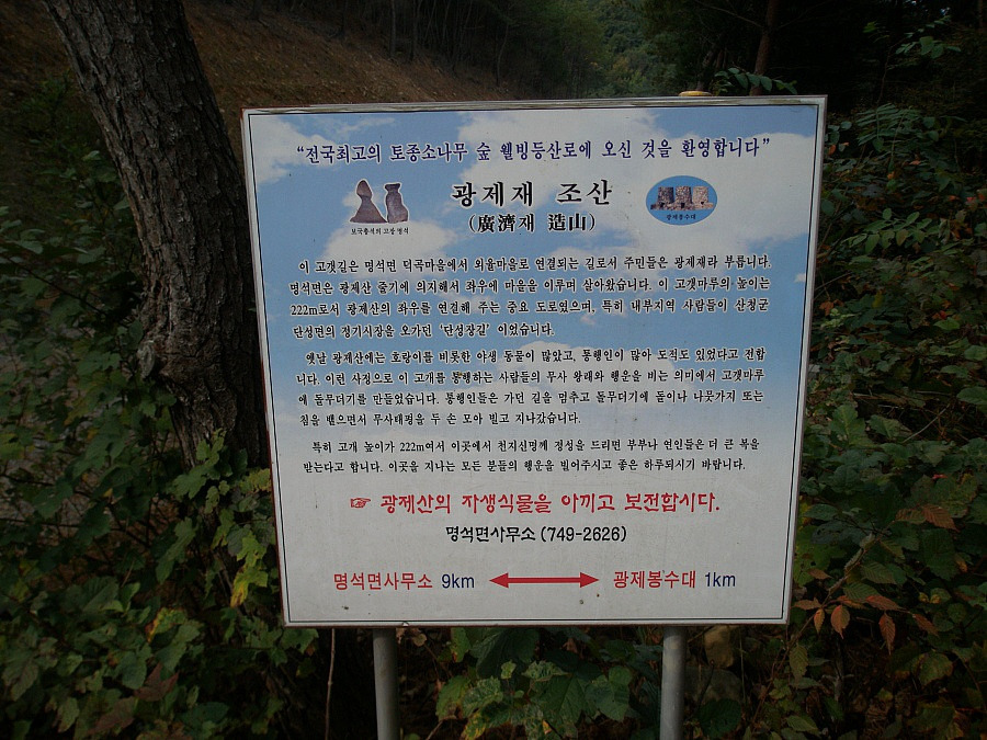 광제봉을 바라고 출발하여 토종소나무로 이루어진 아름다운 소나무 숲길을 걸으니 때마침 청명한 가을의 정취와 어울어져 저절로 휘바람이 흥얼거려질 정도다. 향긋한 솔향과 함께 피톤치드의 내음을 가슴으로 느끼며 걷다보니 광제봉을 언제 지나쳤는지 모르게 지나치고 내리막길로 내려서니 세갈래 갈림길이 나타난다. 우리는 여기에서 지도공부를 한 후 방향을 결정하고 직진코스가 아닌 좌측 방향으로 내려선다.